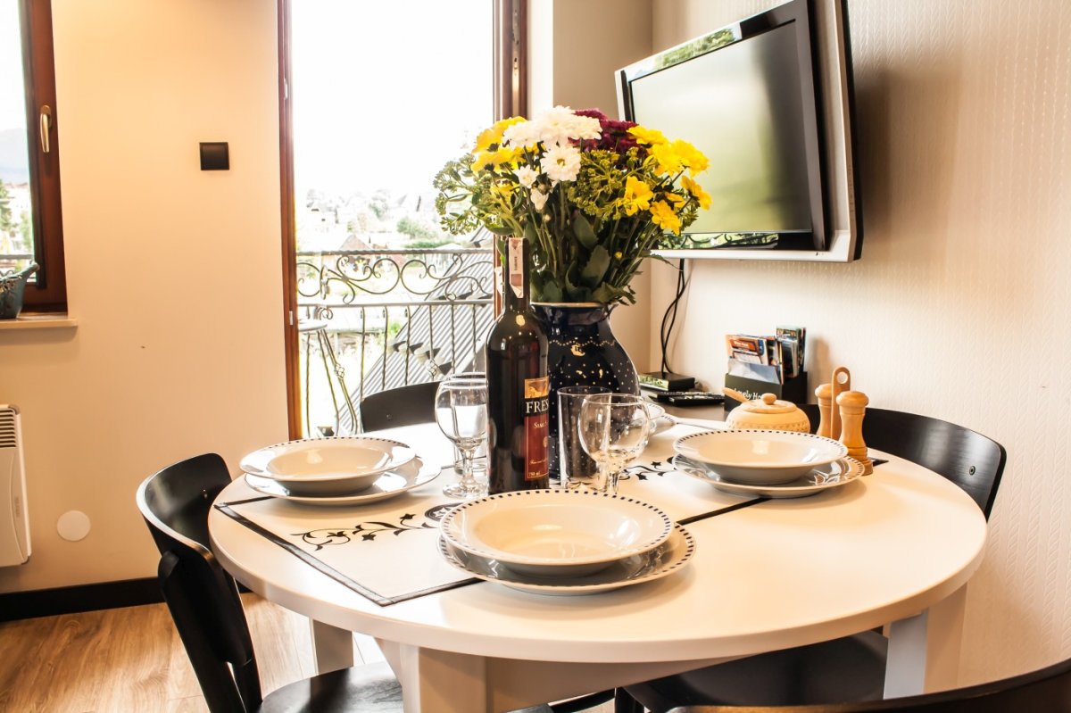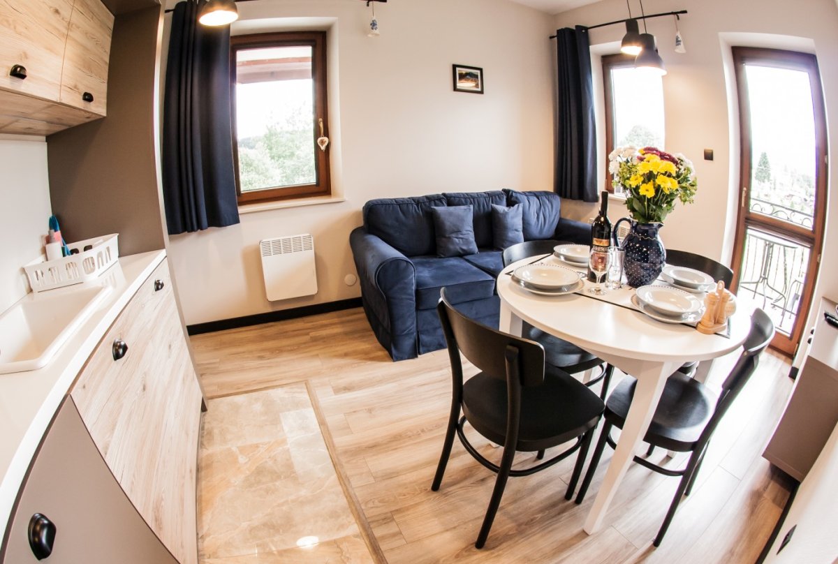 Powierzchnia apartamentu to ok. 43m2, umiejscowiony jest na pierwszym pietrze. Salon połączony jest z aneksem kuchennym z którego jest wyjście na balkon z pięknym widokiem na panoramę Tatr.