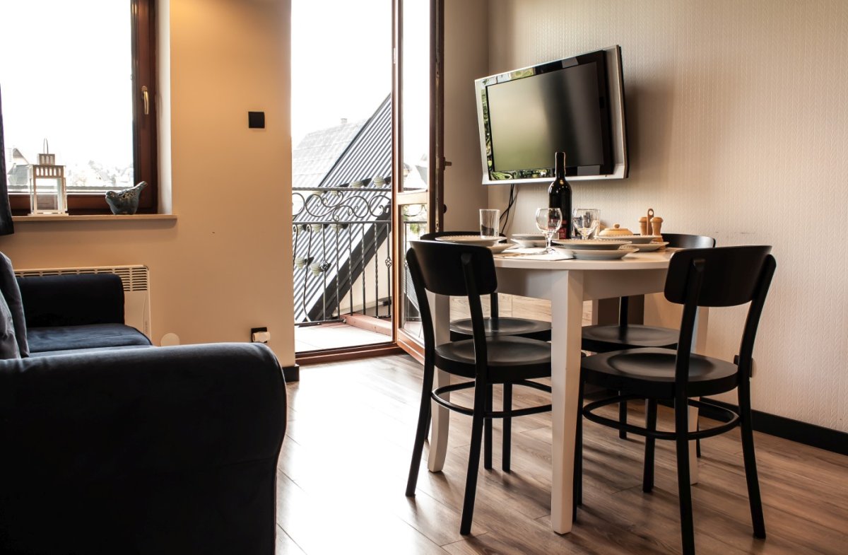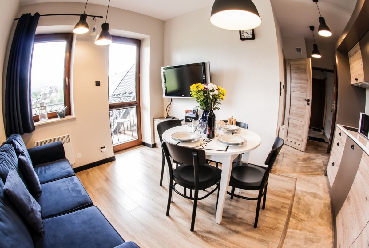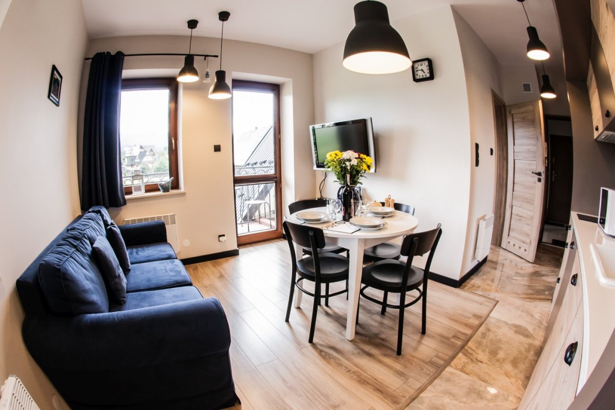 Powierzchnia apartamentu to ok. 43m2, umiejscowiony jest na pierwszym pietrze. Salon połączony jest z aneksem kuchennym z którego jest wyjście na balkon z pięknym widokiem na panoramę Tatr.