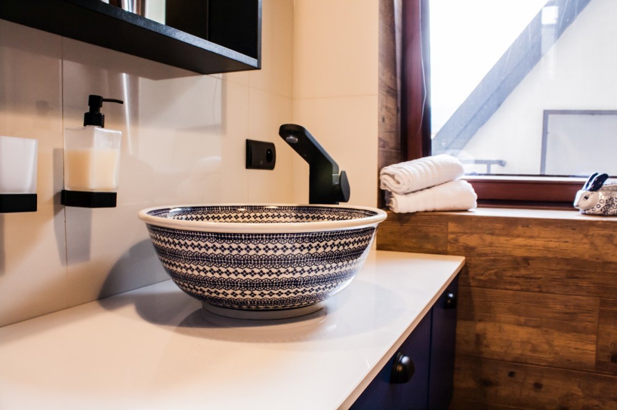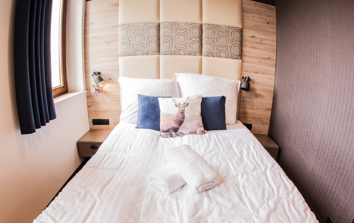 Zapewniamy dla każdego gościa komplet pościeli poduszka z pierzyna oraz duży ręcznik kąpielowy. W salonie jest możliwość rozłożenia sofy jako miejsca noclegowego dla dwóch osób, pokój posiada rownież telewizor LCD 42 calowy. W łazience znajduje się kabina prysznicowa. Aneks kuchenny wyposażony jest w mała lodówkę z zamrażalnikiem, zmywarkę do naczyń, płytę indukcyjna, kuchenkę mikrofalowa, czajnik elektryczny. Komplet naczyń i garnków oraz szereg dodatkowych akcesoriów kuchennych.